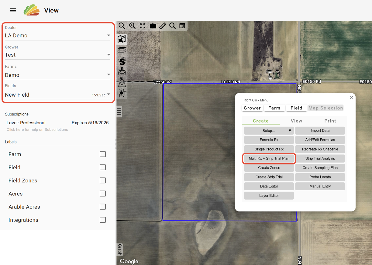 -In the View tool, with the desired Grower, Farm, and Field selected, click the 'Multi Rx + Strip Trial Plan' button in the Right-Click Menu.