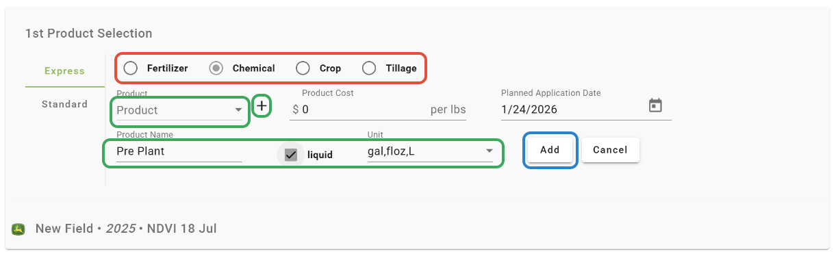 -Select a Product from the list, or click the '+' button to add a custom Product.