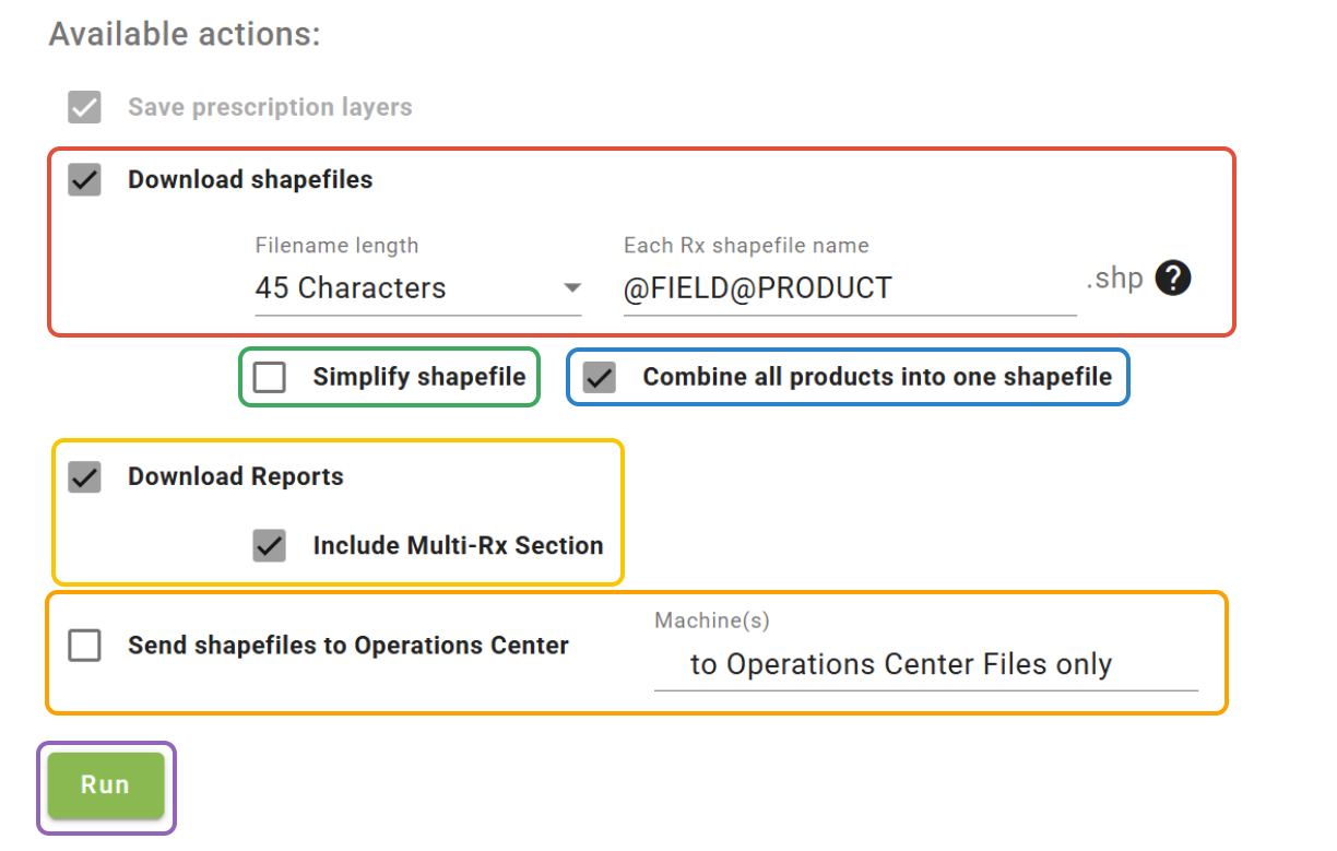 - Check the 'Send shapefiles to Operations Center™' box to send the Rx's to the files page within Operations Center™. Select machines from the dropdown to send the Rx's directly to machines.