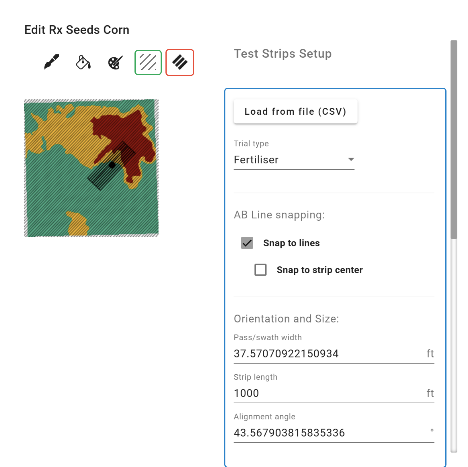 -If AB lines are available for the field, these can be displayed and used to align the strips by clicking the 'Show AB lines' button.