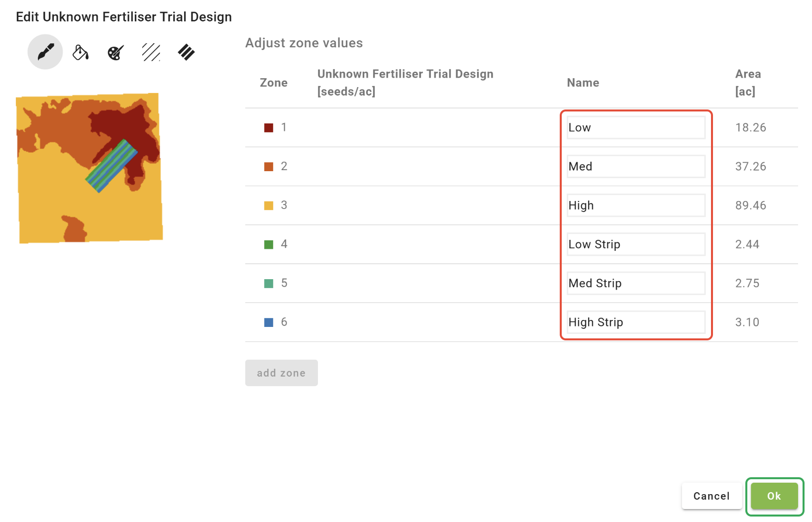 -The layer(s) can be manually edited with a brush tool and/or a fill tool. The fill tool is useful for merging zones.