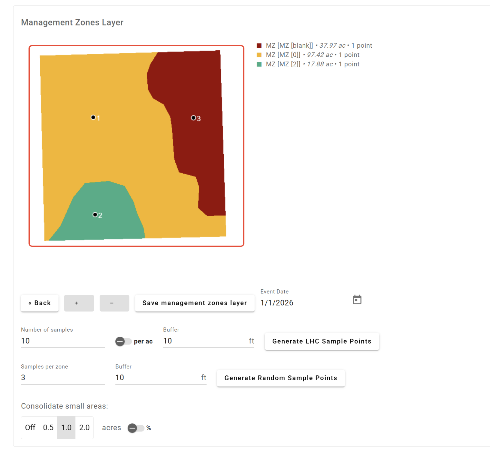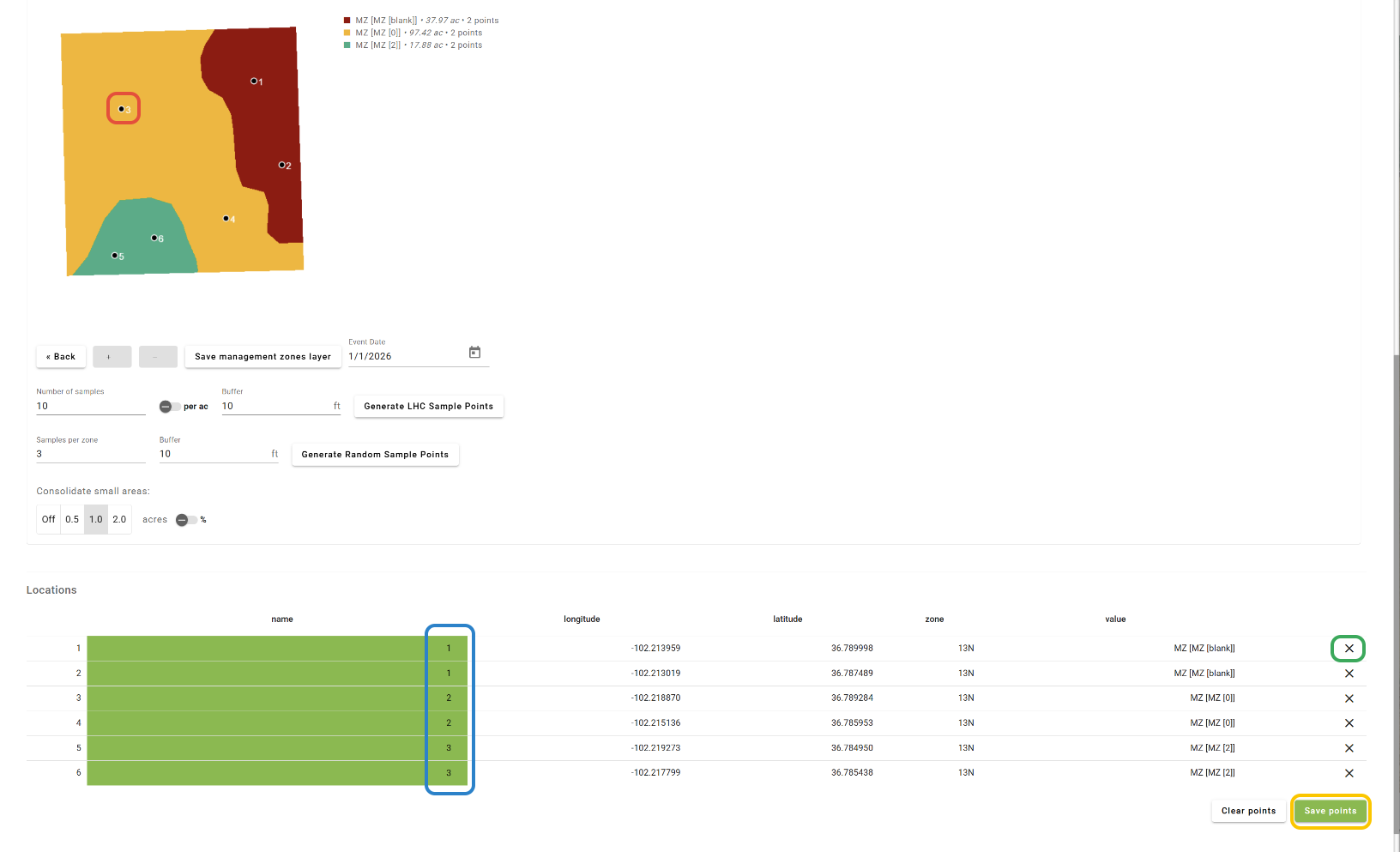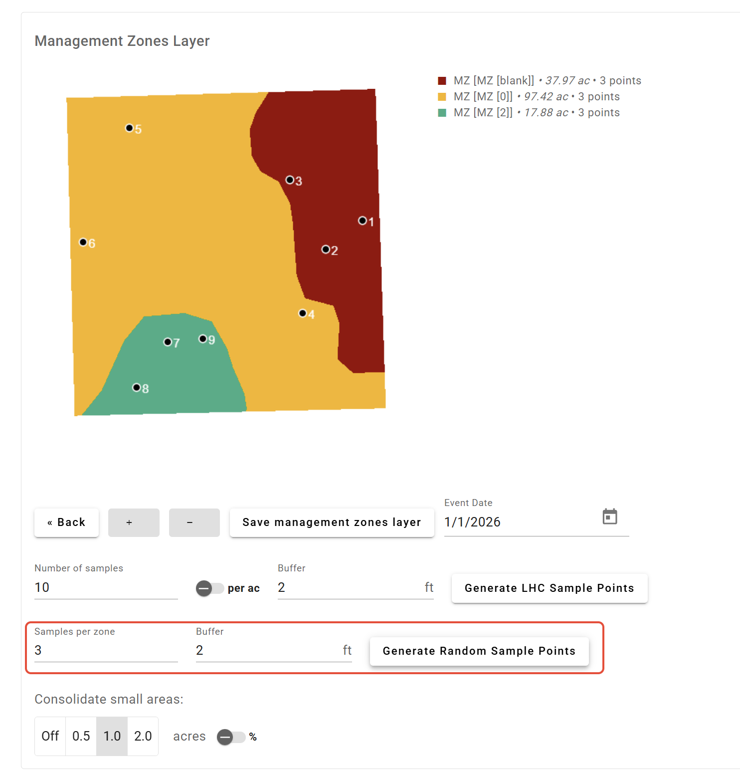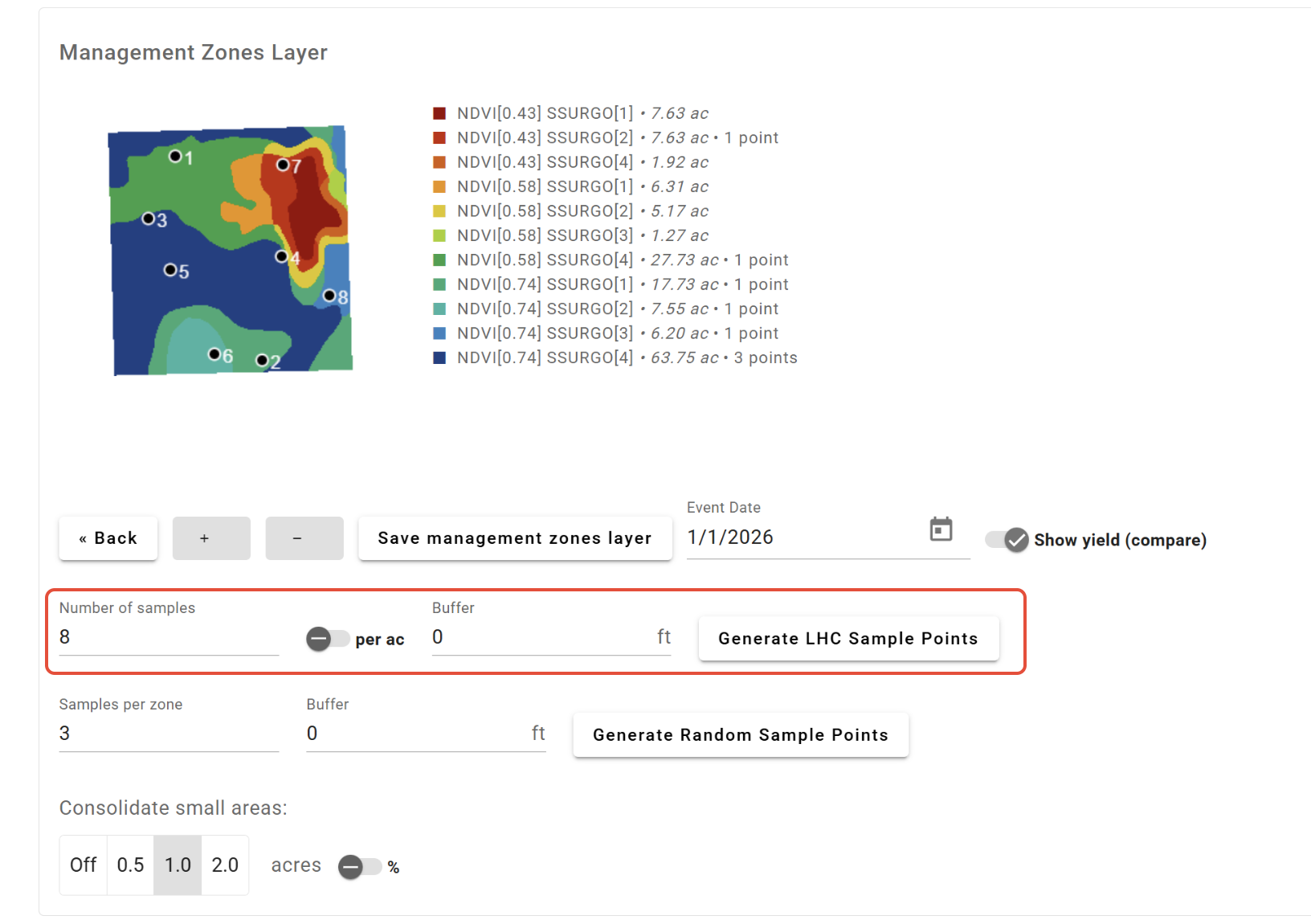 The number of samples can be set by field or per acre. And the buffer ensures that points are placed away from the field and zone boundaries.