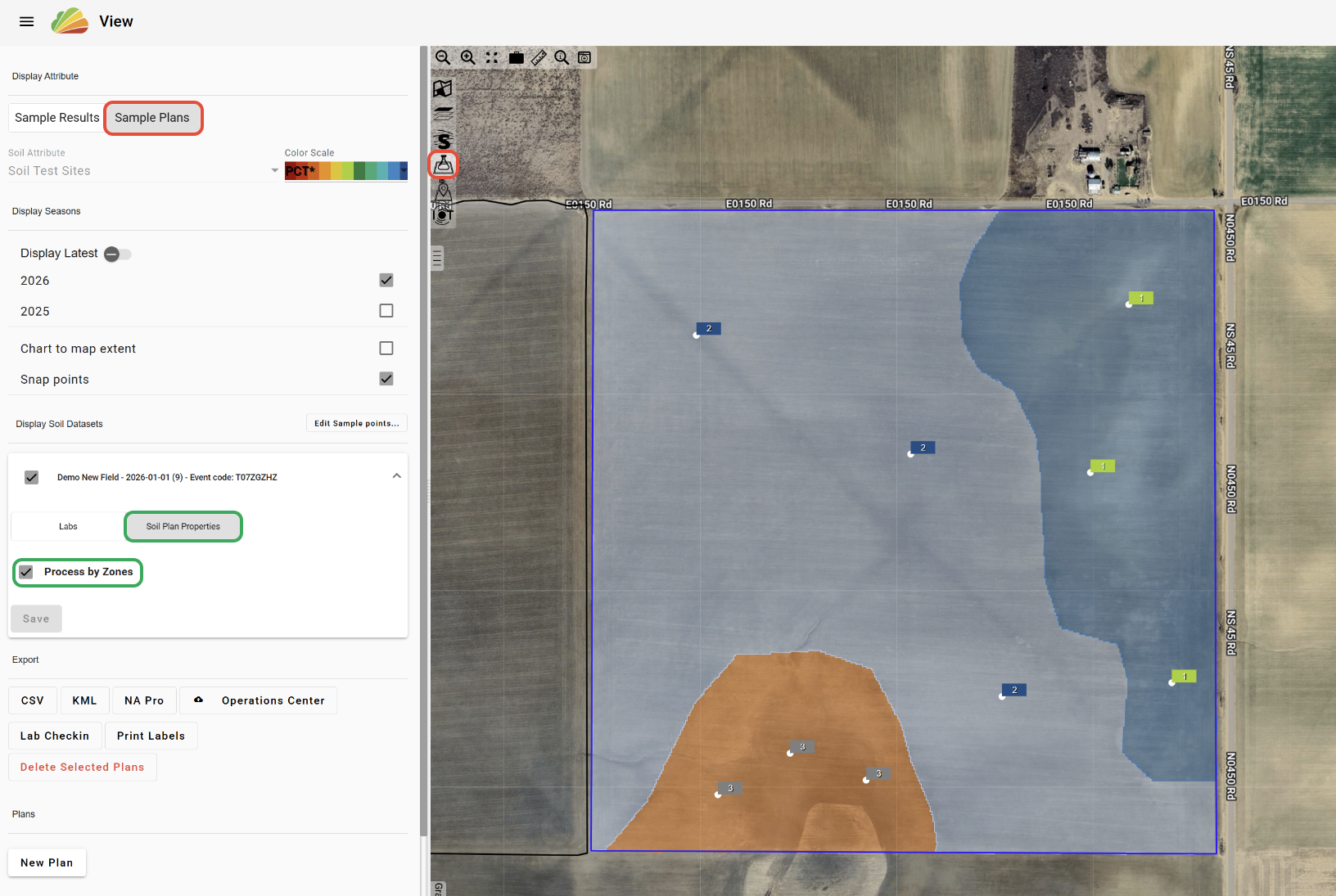 If the plan is for zone sampling, be sure to check the 'Process by Zones' box under the 'Soil Plan Properties' tab.
