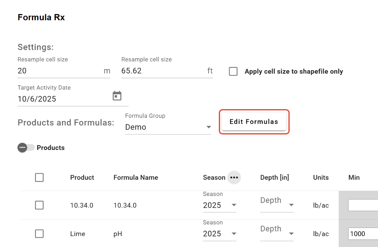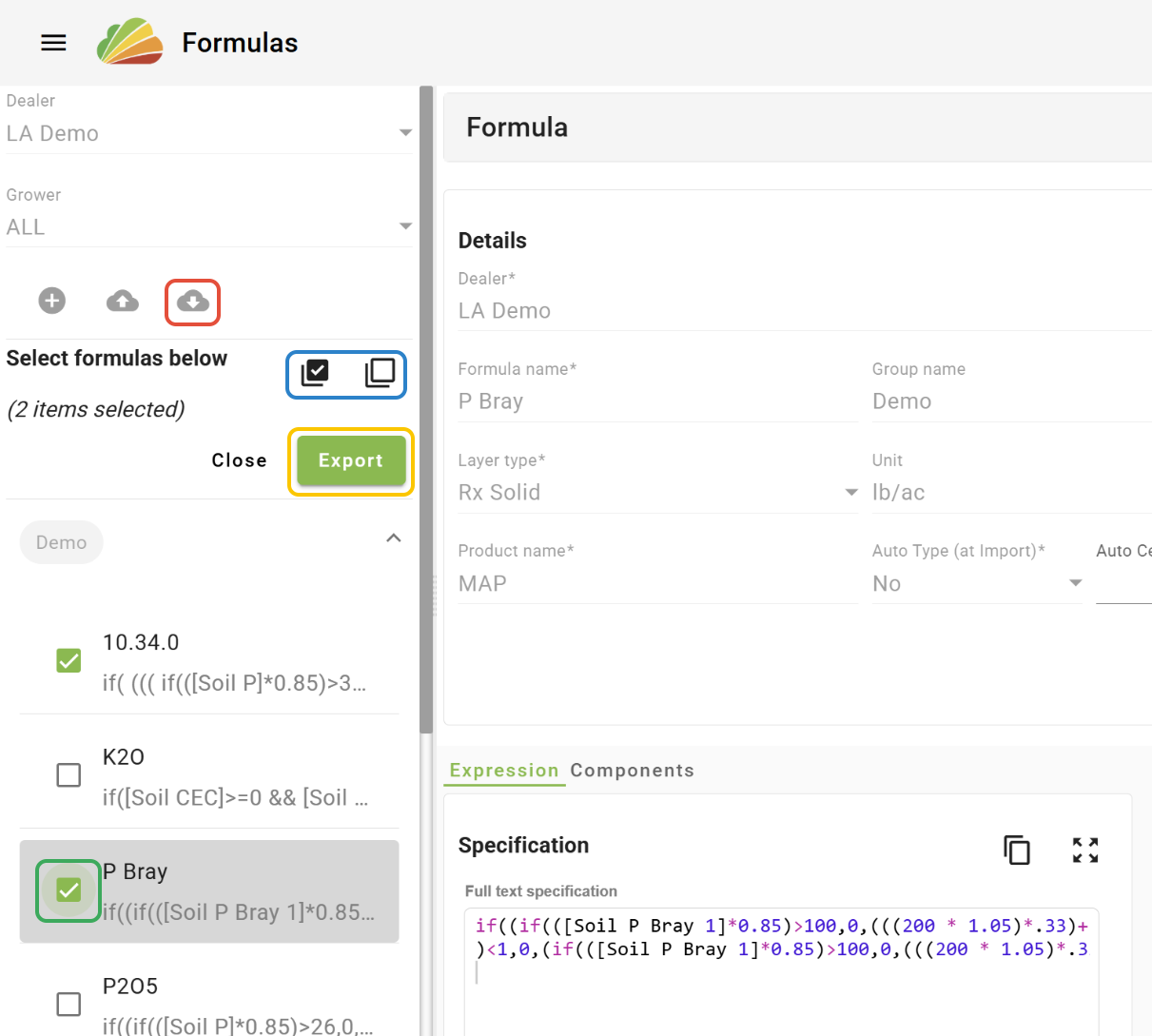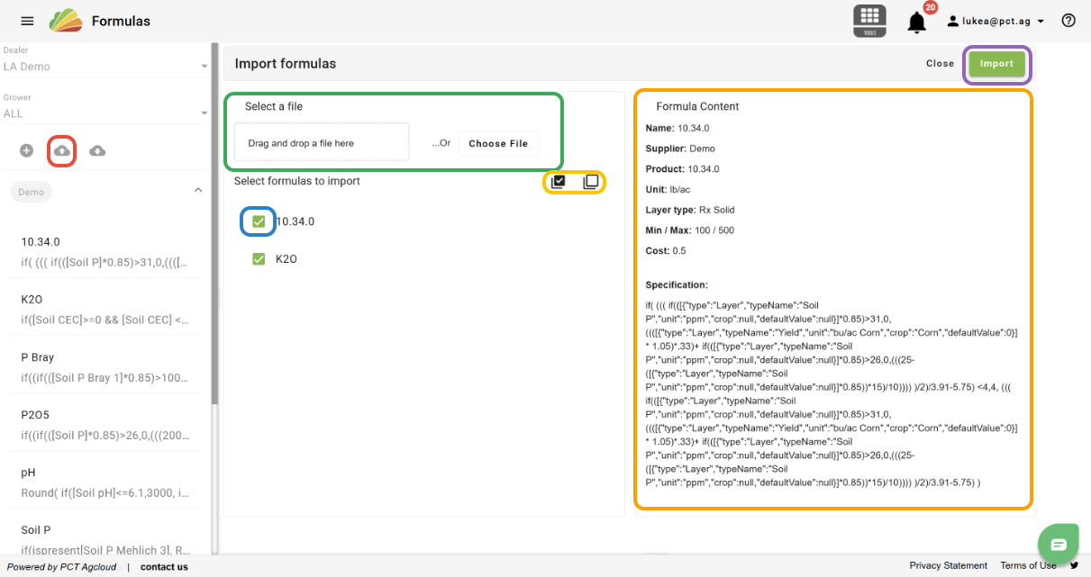 Formulas can be exported and imported as files. This can be useful for creating multiple versions of formulas, moving formulas between Dealers and Growers, or saving a backup of your formulas.
