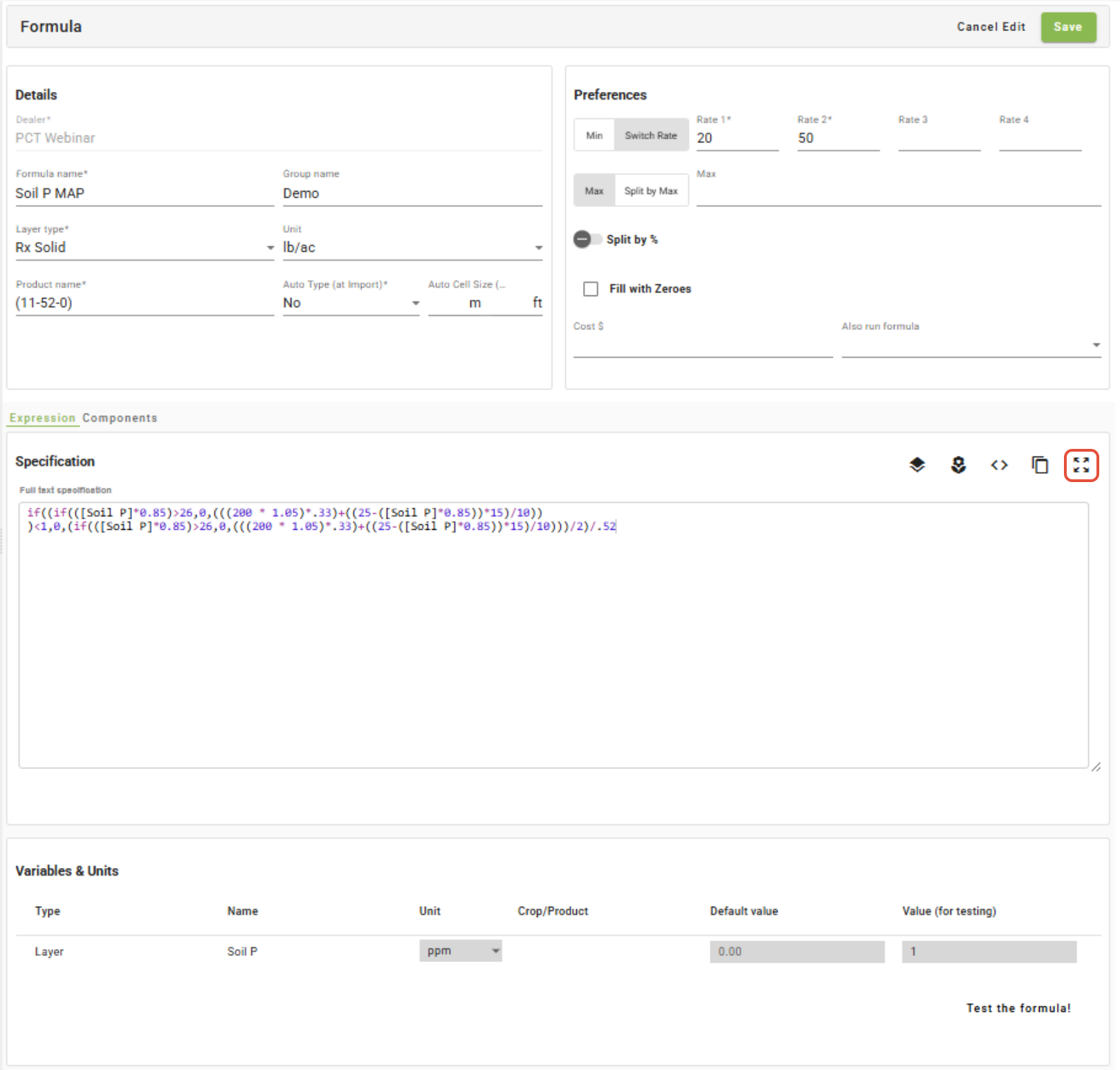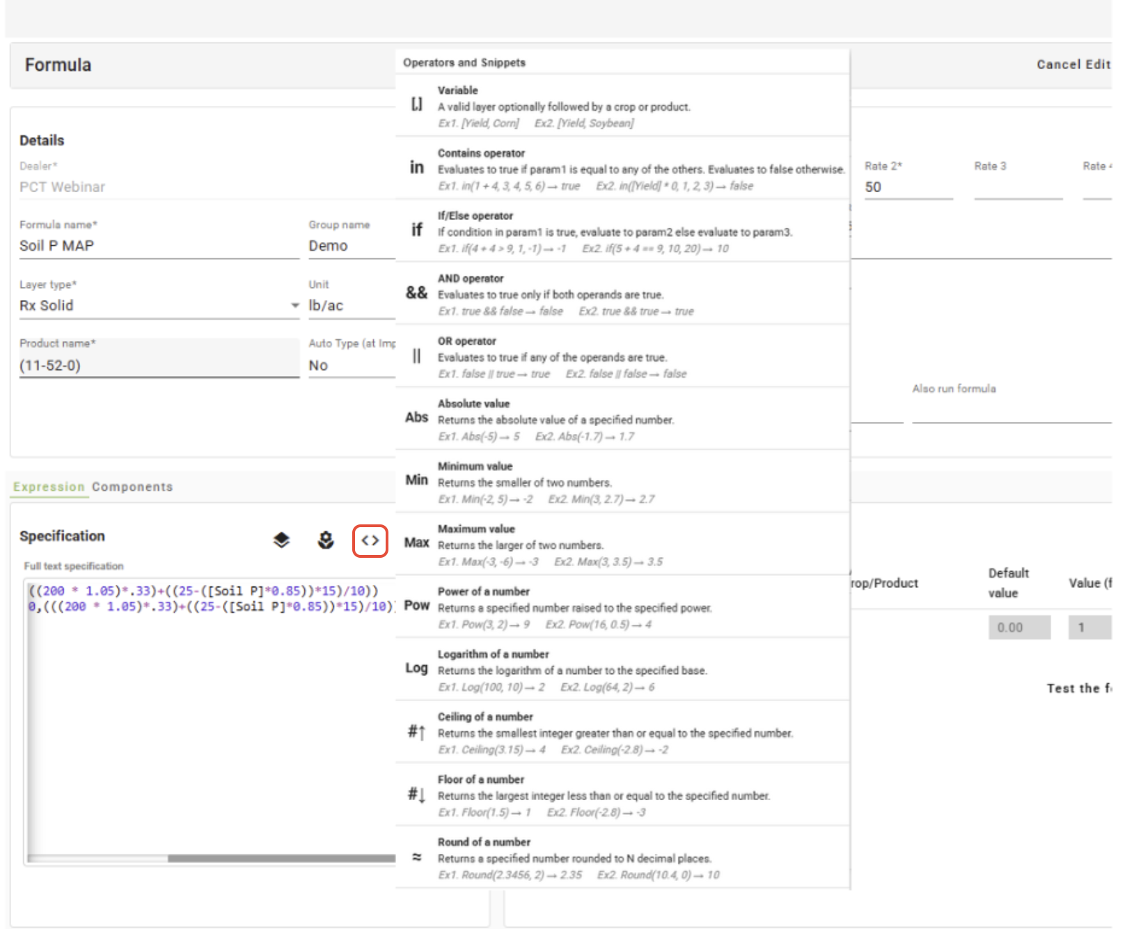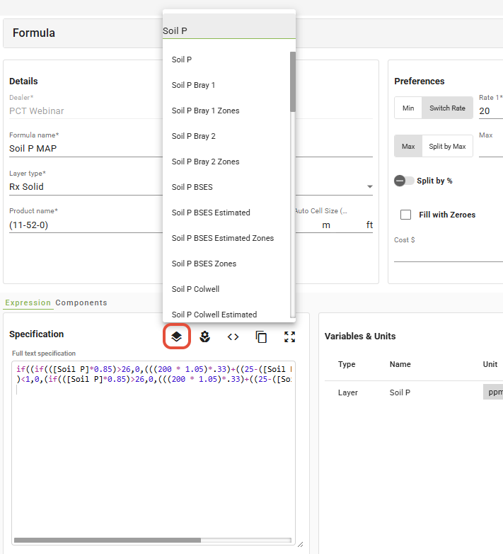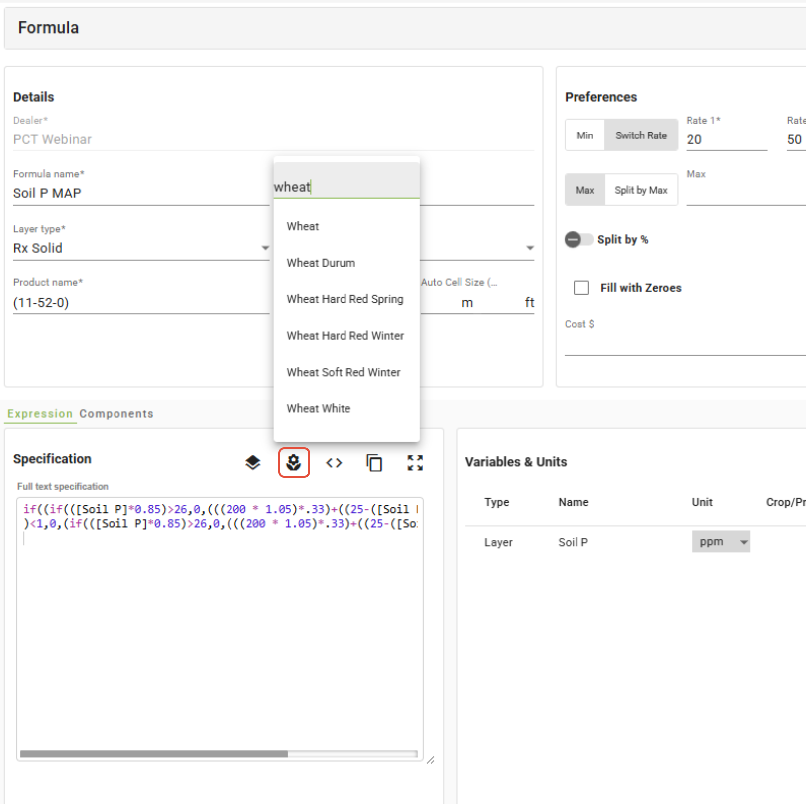 Under the Expression tab, the formula itself is stored ('Specification'), and the 'Variables & Units' are configured. Formulas in PCT Agcloud follow a simple, spreadsheet-style syntax that combines field data (soil tests, yield maps, etc.) with mathematical and logical expressions to calculate output layers. These output layers are most commonly fertilizer or seeding prescriptions, although other layers are available. The formula syntax, or the correct structure and arrangement of the components within the formula, is explained below.