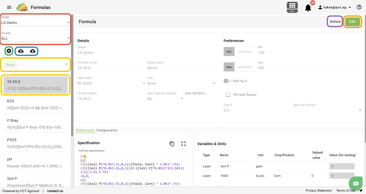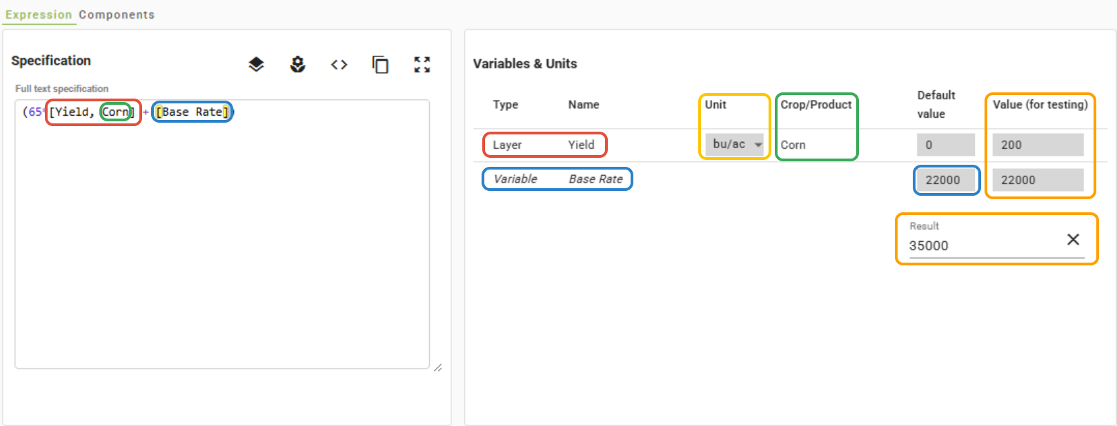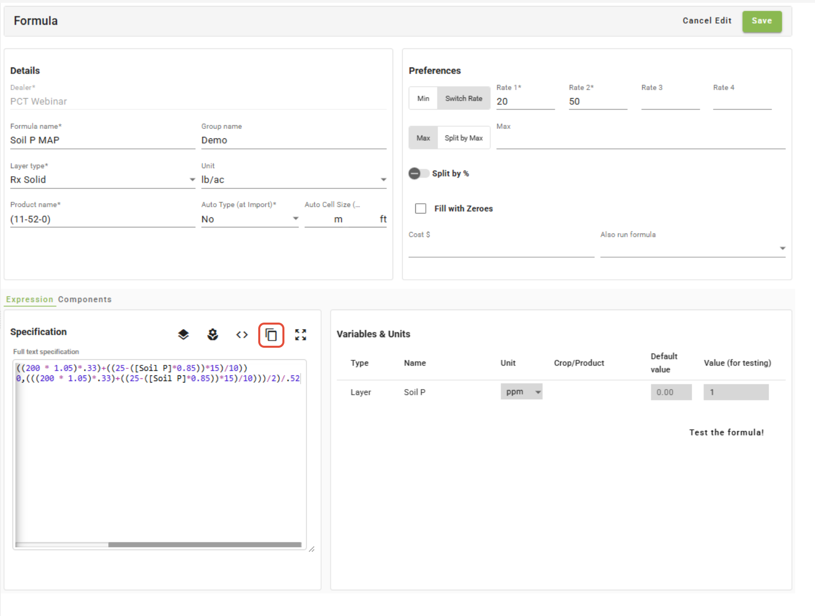 Under the Expression tab, the formula itself is stored ('Specification'), and the 'Variables & Units' are configured. Formulas in PCT Agcloud follow a simple, spreadsheet-style syntax that combines field data (soil tests, yield maps, etc.) with mathematical and logical expressions to calculate output layers. These output layers are most commonly fertilizer or seeding prescriptions, although other layers are available. The formula syntax, or the correct structure and arrangement of the components within the formula, is explained below.