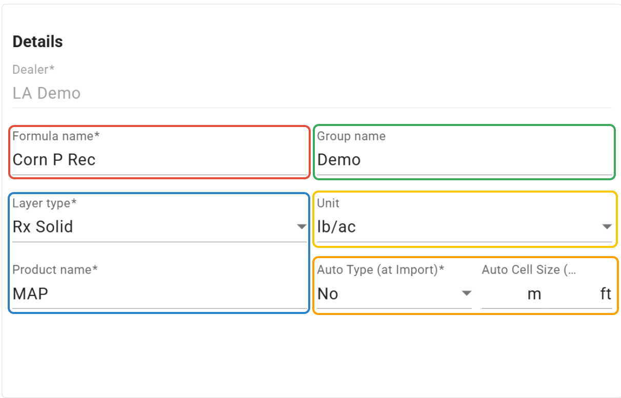 Layer Type & Product name - Required. Specifies the output layer of the formula. When an "Rx" layer type is selected, this assumes the formula is generating a product recommendation, and the 'Product name' line is made available. Other layer types, including nutrient recommendations, can be selected. In this case, a product conversion can be applied after the fact. More info on this process is contained below.