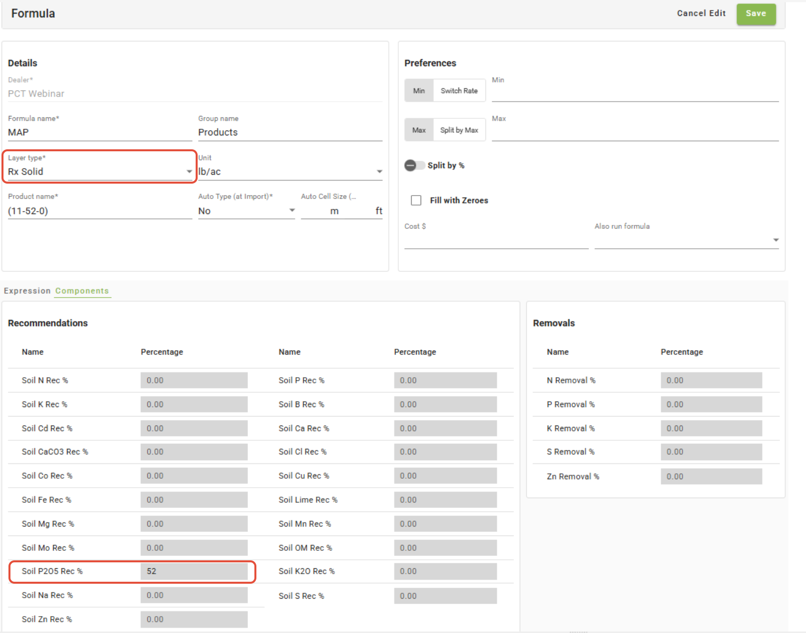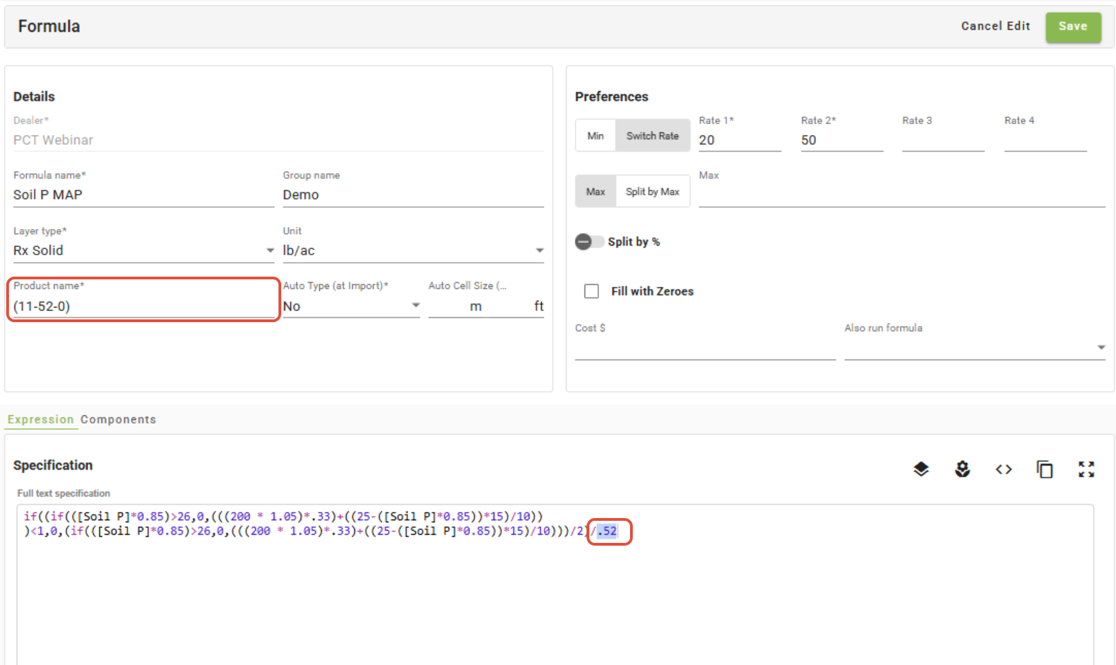 Product conversions can be added directly into formulas in the "Specification" box. To do this, simply divide by the nutrient percentage at the end of the formula. This option removes the extra step of first creating a nutrient rec layer and then applying a product to create an Rx layer.