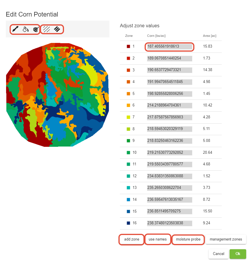 By clicking the 'Edit' button, you can manually edit the zones using the paint tools, add AB lines and Strip Trials, edit the values in the yield column, add zones, use names for the zones, or add a moisture probe location.