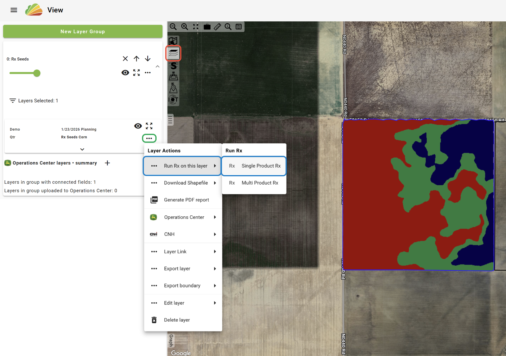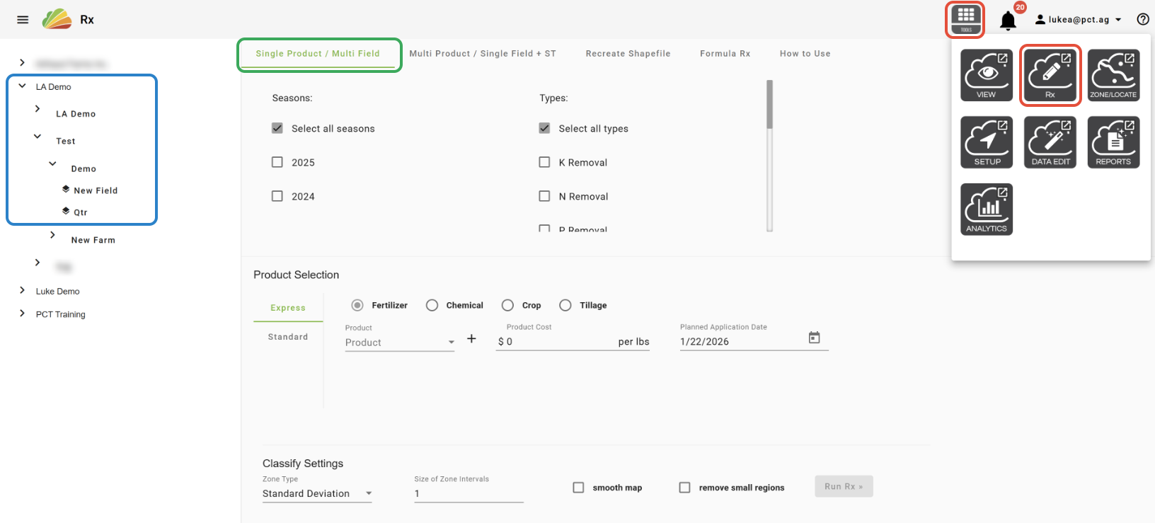 -In the View tool, with the desired Grower, Farm(s), and/or Field(s) selected, click the 'Single Product Rx' button in the Right-Click Menu.