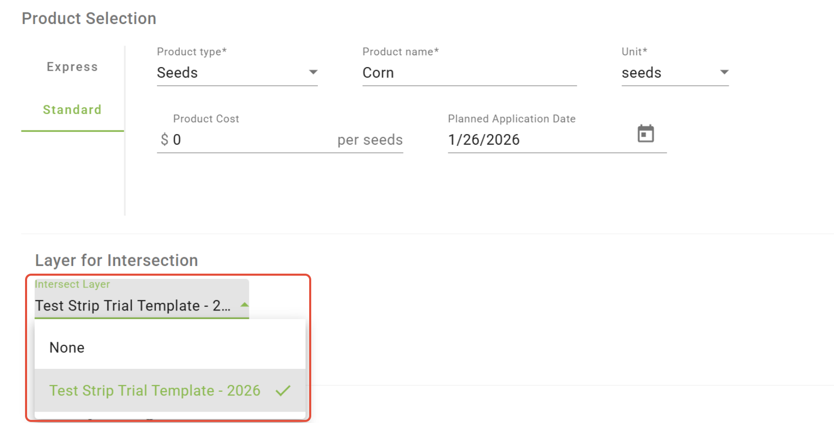 -Farming Type and Strip Trial layers can be selected as an intersecting layer to be included in the Rx.