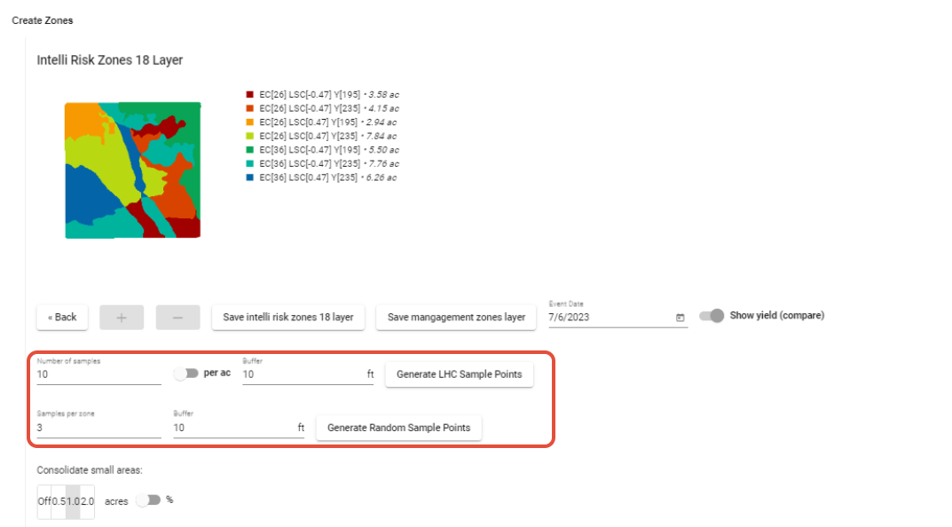 Soil sampling plans can also be generated using either stratified random sampling with the 'Generate Random Sample Points' button or conditioned Latin hypercube sampling with the 'Generate LHC Sample Points' button. For both options, you may select a buffer width to prevent sampling on the edges of fields or boundaries between zones.