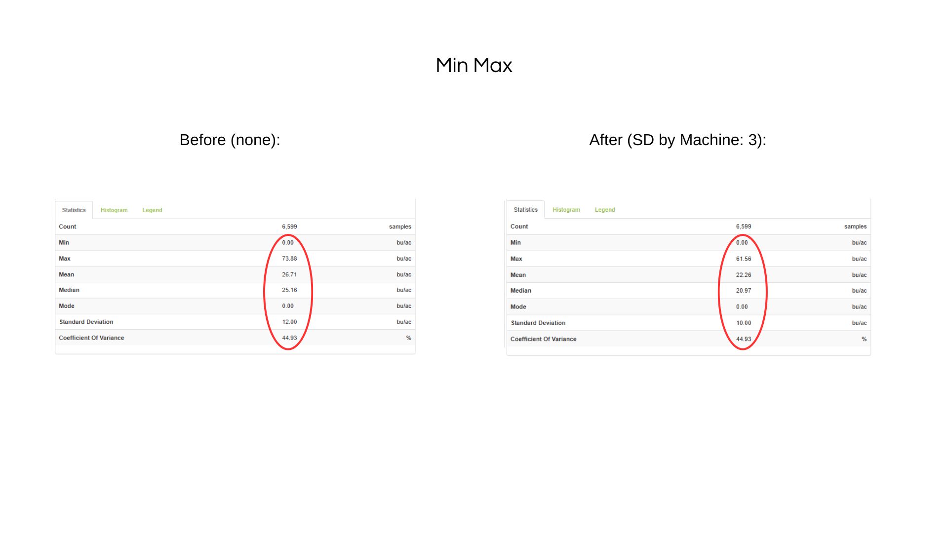 For 'Min', 'Max', and 'SD min max', it is best to set a min/max in the 'Min Max' filter as well as the calibration filters, as re-calibration may adjust some values below 0. This can be applied to a specific machine using the 'Machine Name' dropdown.