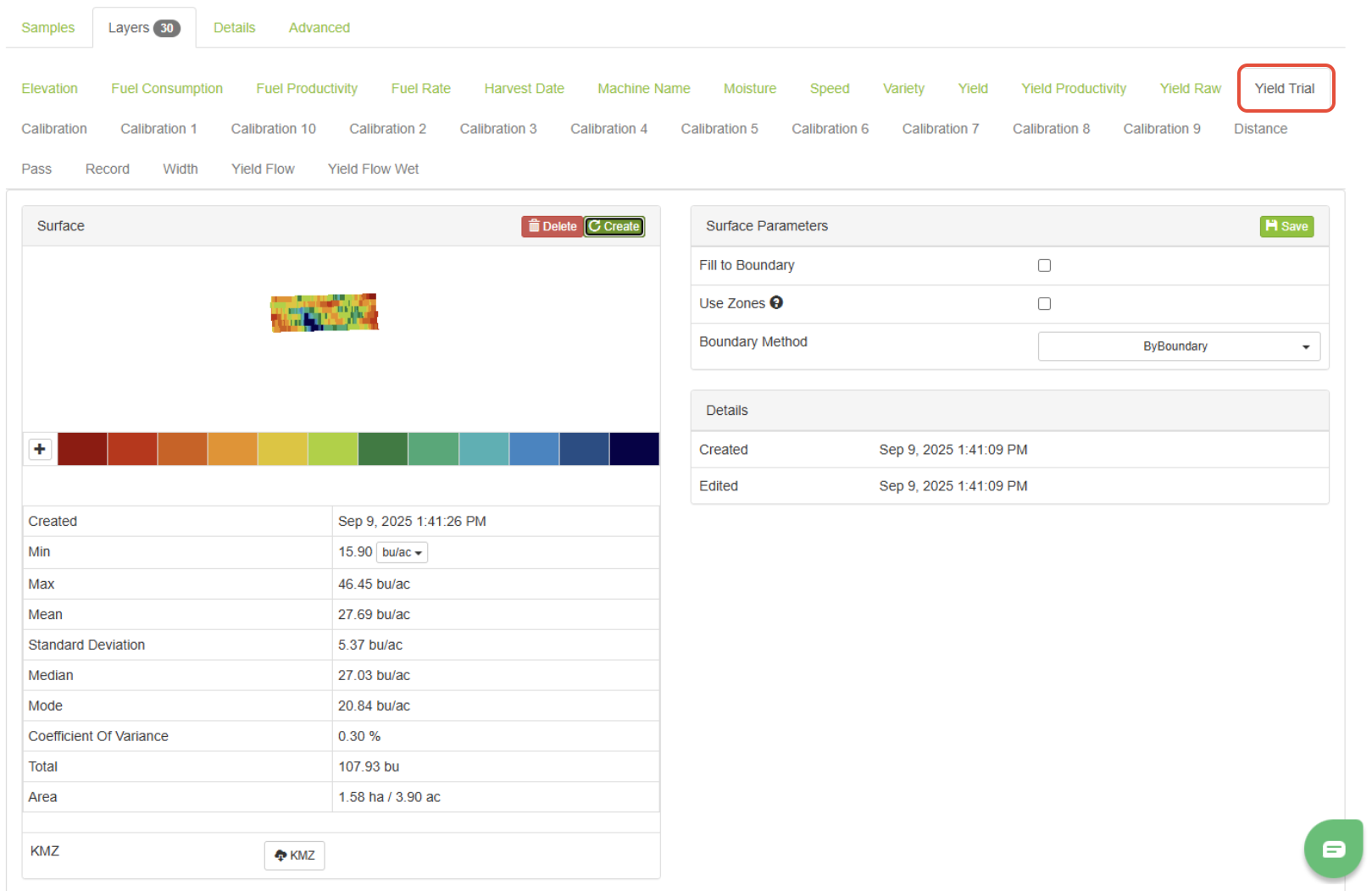 The Surface Parameters affect the method in which the layer is surfaced from the dataset. The 'Fill to Boundary' box, when checked, will interpolate the data out to the field boundary. The Boundary Method dropdown is typically used for surfacing zone soil samples, using either the 'Zones' or 'Zones Averaged' option. When any adjustment is made, the 'Save' button must be clicked, then the layer must be recreated.
