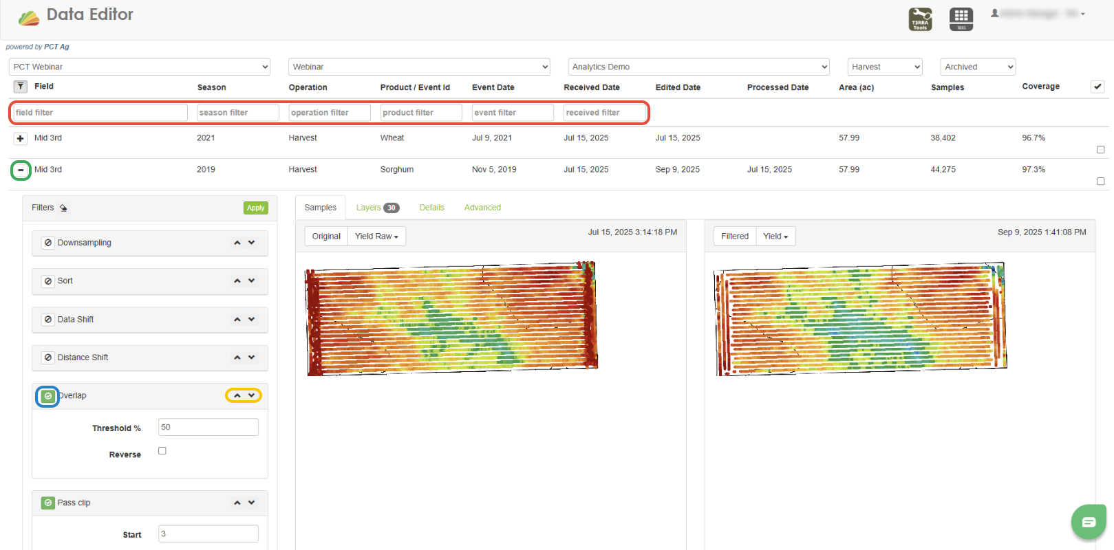 Allows you to designate trial areas in the dataset using polygons. These trial areas can then be surfaced as their own layer type (Yield Trial). The Yield Trial layer can be used to limit filtering, and it can be more accurate trial analysis since it applies less interpolation between points.