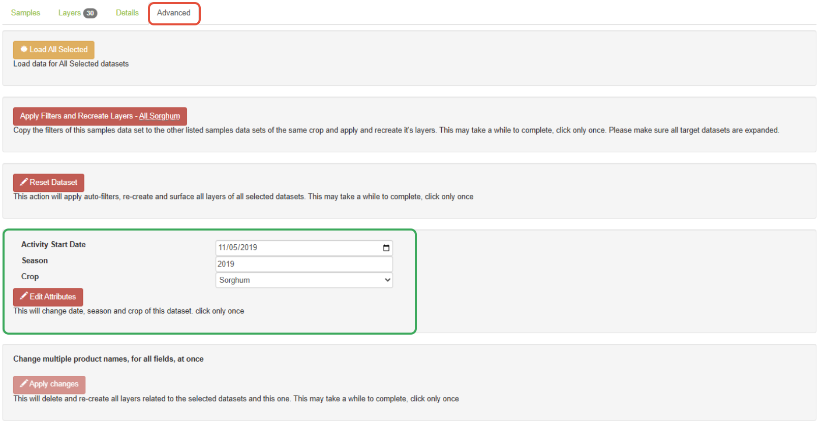 The 'Advanced' tab contains many options for editing one or more datasets and details of those datasets.