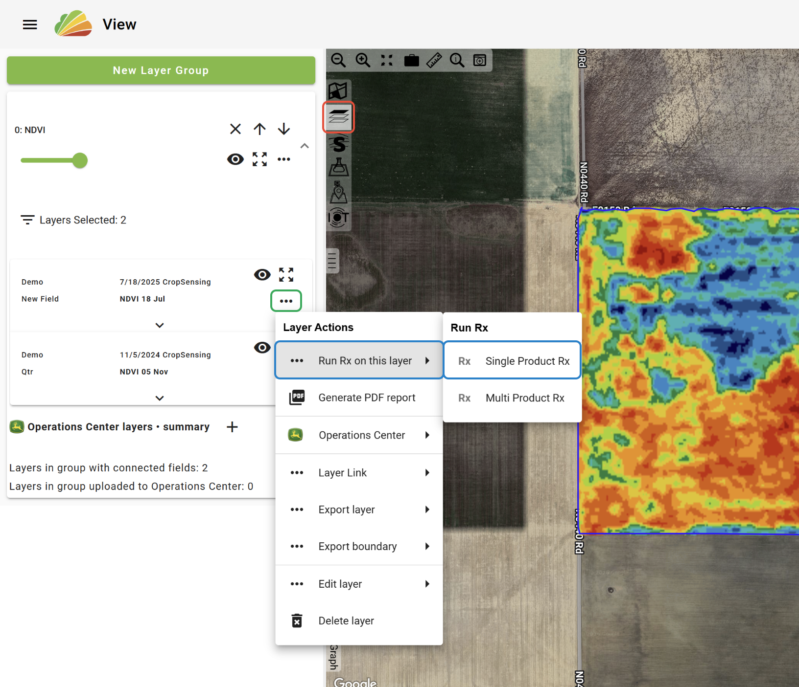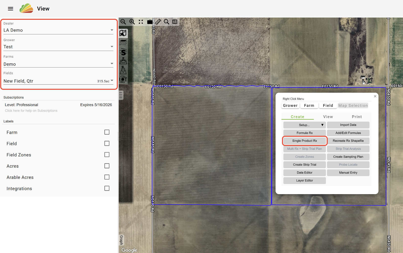 -In the View tool, with the desired Grower, Farm(s), and/or Field(s) selected, click the 'Single Product Rx' button in the Right-Click Menu.
