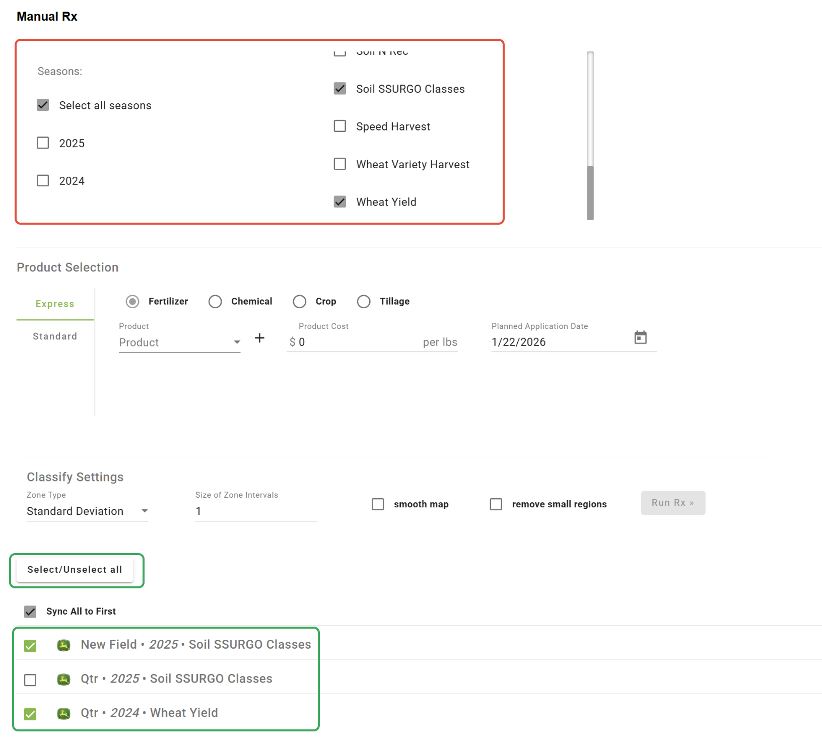 -Farming Type and Strip Trial layers can be selected as an intersecting layer to be included in the Rx.