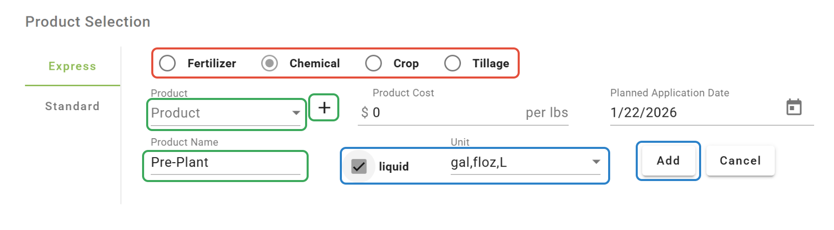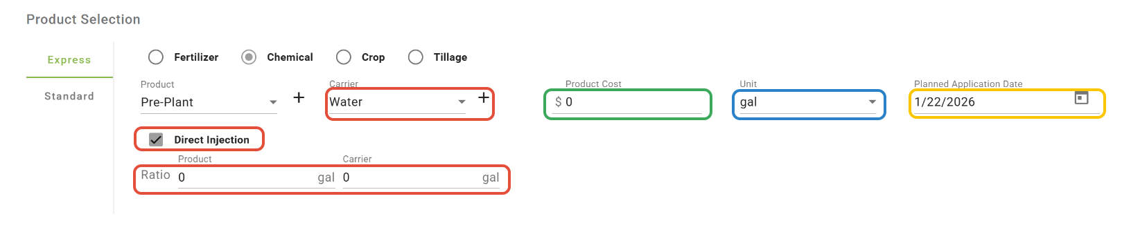 -For Liquid Products, a Carrier can be selected (optional) and the Product and Carrier rates can be entered independently. If needed, Direct Injection volumes can be specified.