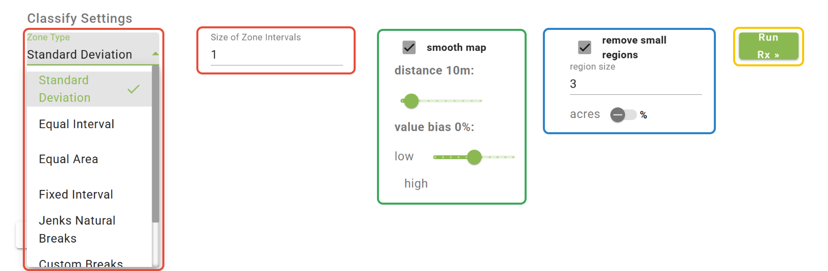 -The 'remove small regions' option allows you to set a minimum polygon size. This can be done by the acre or by field percentage.