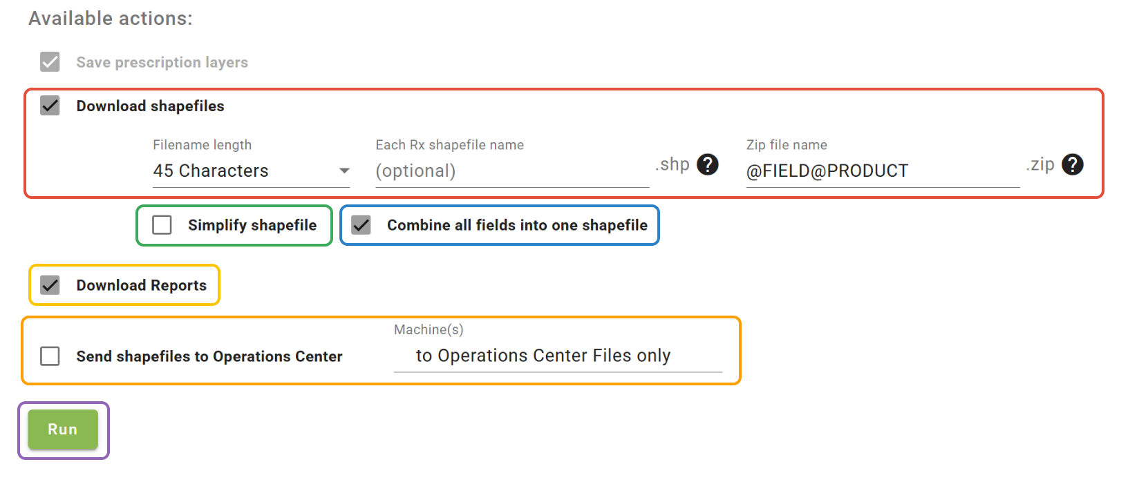 - Check the 'Send shapefiles to Operations Center™' box to send the Rx's to the files page within Operations Center™. Select machines from the dropdown to send the Rx's directly to machines.