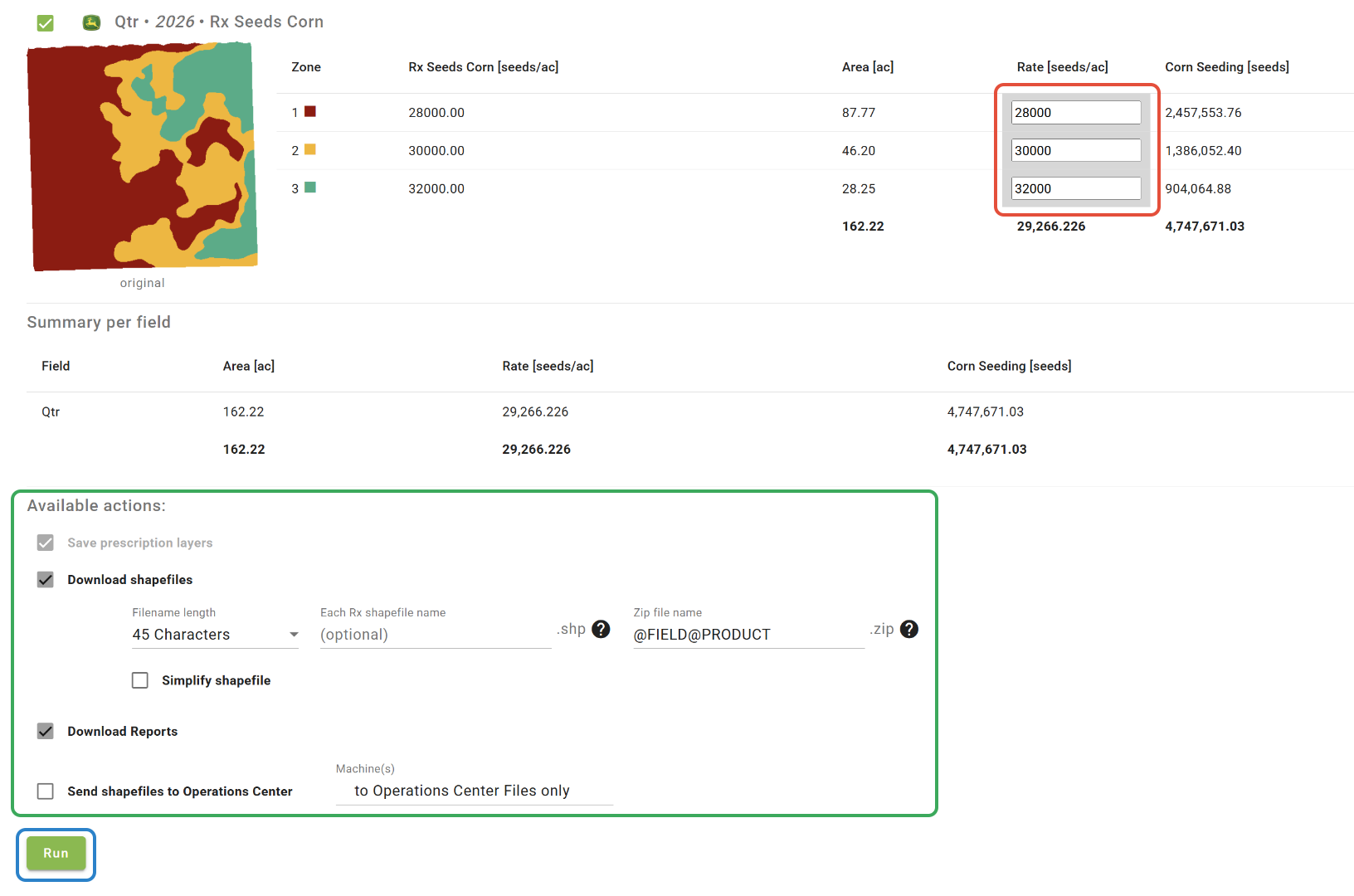 -If you choose to download the Rx shapefiles, you can choose the Filename length (character limit), as well as choose a custom name for either the individual files or the Zip file. The default naming format for the files contained within the ZIP file is GrowerFarmFieldProduct. If needed, the filename will be abbreviated in that order. A custom name can be entered for either the individual files or the ZIP file that will be applied to all, or a template of sorts can be made by using the @ sign to specify which naming components should be included in the filename. This template will be saved for the next time the tool is opened.