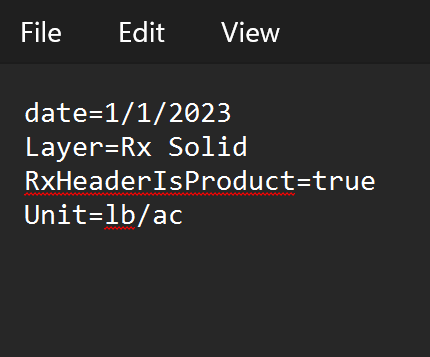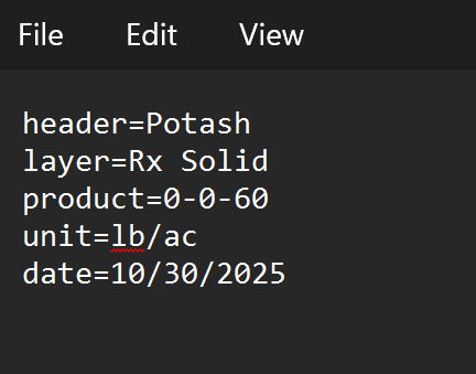 The steps for importing multiple Rx layers at a time are similar to the steps above. Like the process for importing multiple Management Zone layers at a time, the .txt file included within the folder must be named "import". The other difference that is necessary when importing multiple Rx layers at a time is contained within the .txt file. In the "Bulk Rx" template, the "header" and and "product" lines are replaced with a "RxHeaderIsProduct=true" line. This will not only allow for Rx layers across multiple fields to be imported, but if the file(s) contain multiple products, all of those products will be imported as separate layers as well.