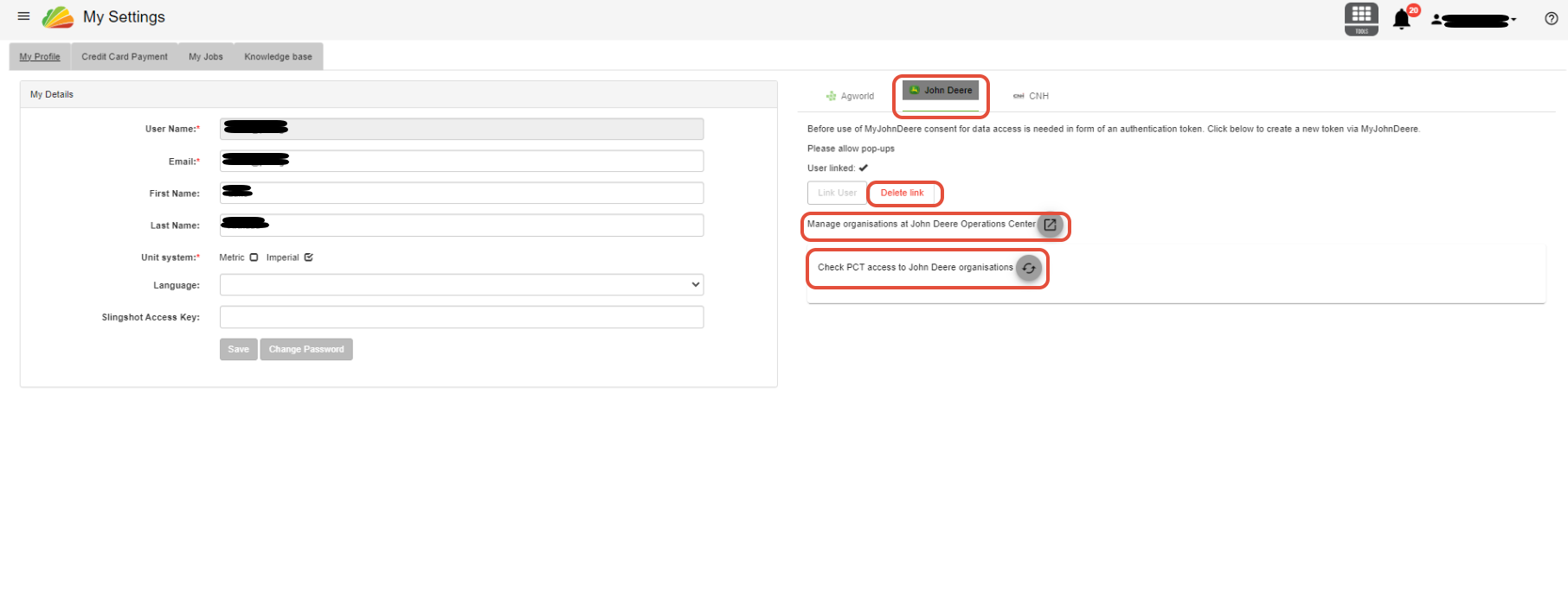 First, try deleting the link and reconnecting. This is done by clicking the 'Delete Link' button in the My Settings page and then following the linking process. Click the following link for info on the linking process: https://pctagcloud-support.freshdesk.com/support/solutions/articles/51000381890-integrating-john-deere-operations-center-with-pct-agcloud.