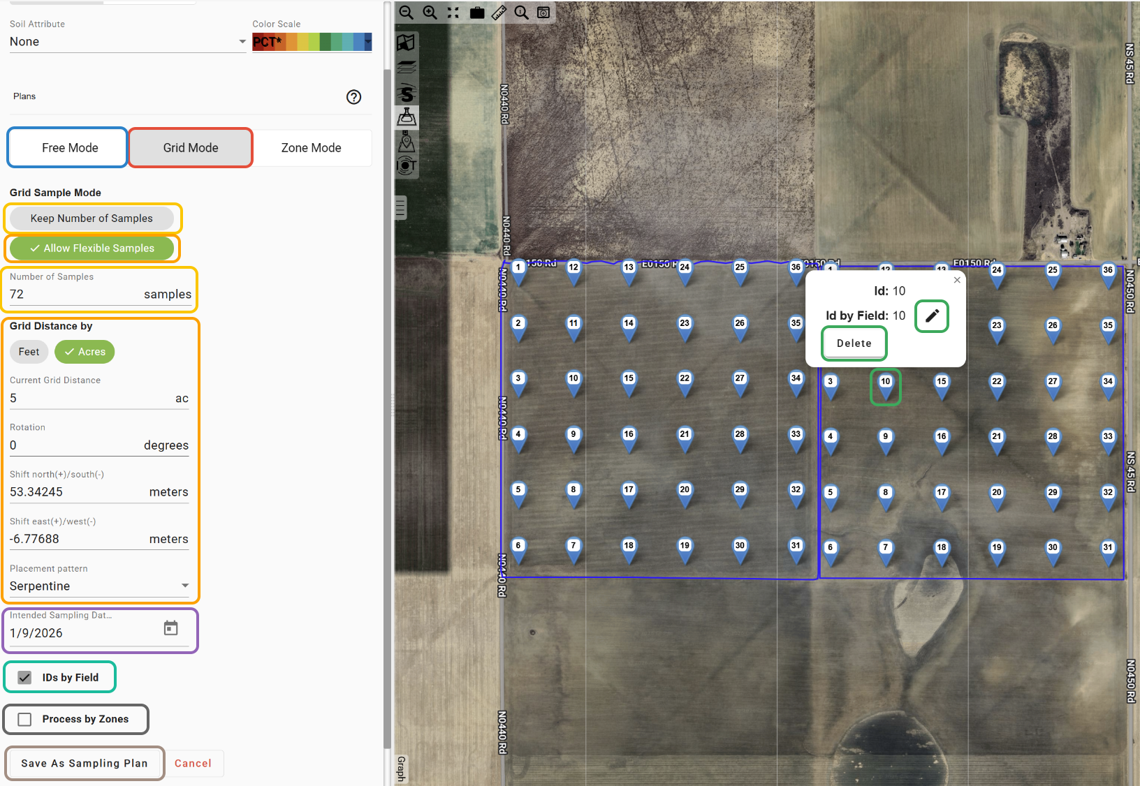 7. To plan the grid based on a set distance in acres or feet, select the 'Allow Flexible Samples' option and set the grid parameters in the lines.