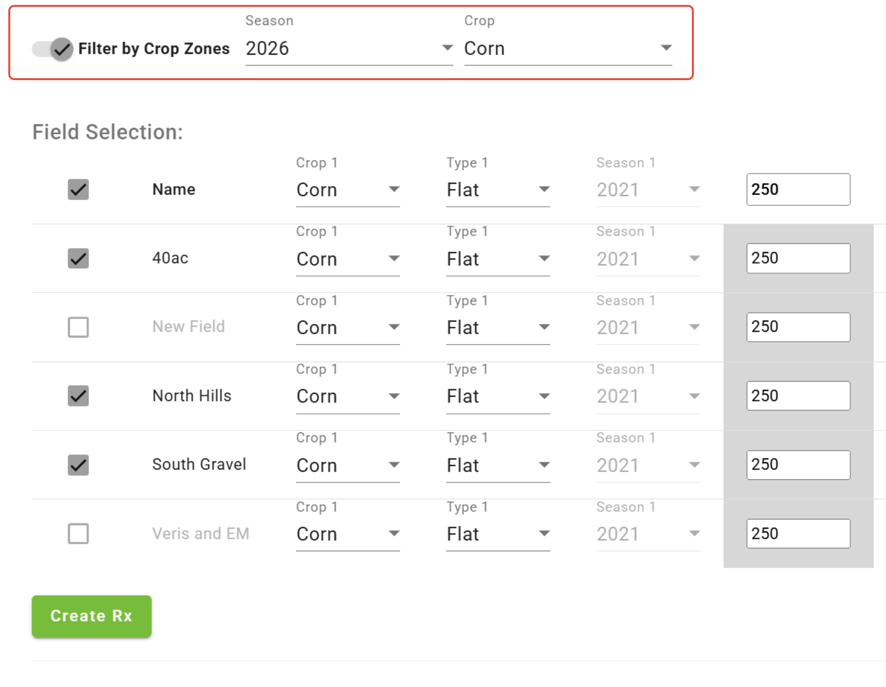 After Season Plans have been created, they can be used to filter fields in the Formula Rx tool. If multiple Crop Zones have been added for a Field, the Rx will only be generated for the zone of the selected Crop. Learn more about the Formula Rx tool HERE.